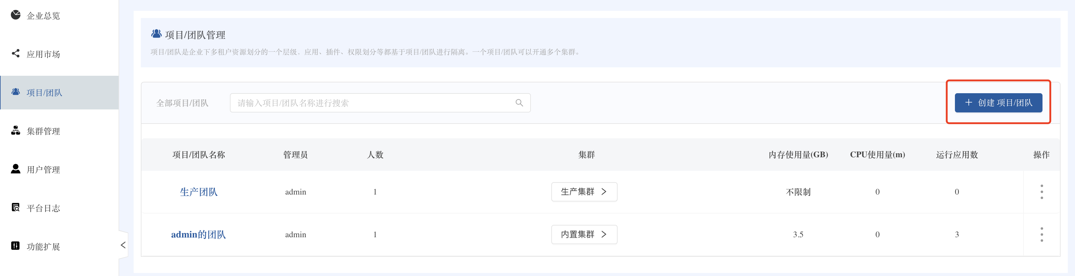 - 进入平台管理 ➡️ 项目/团队 ➡️ 创建项目/团队。